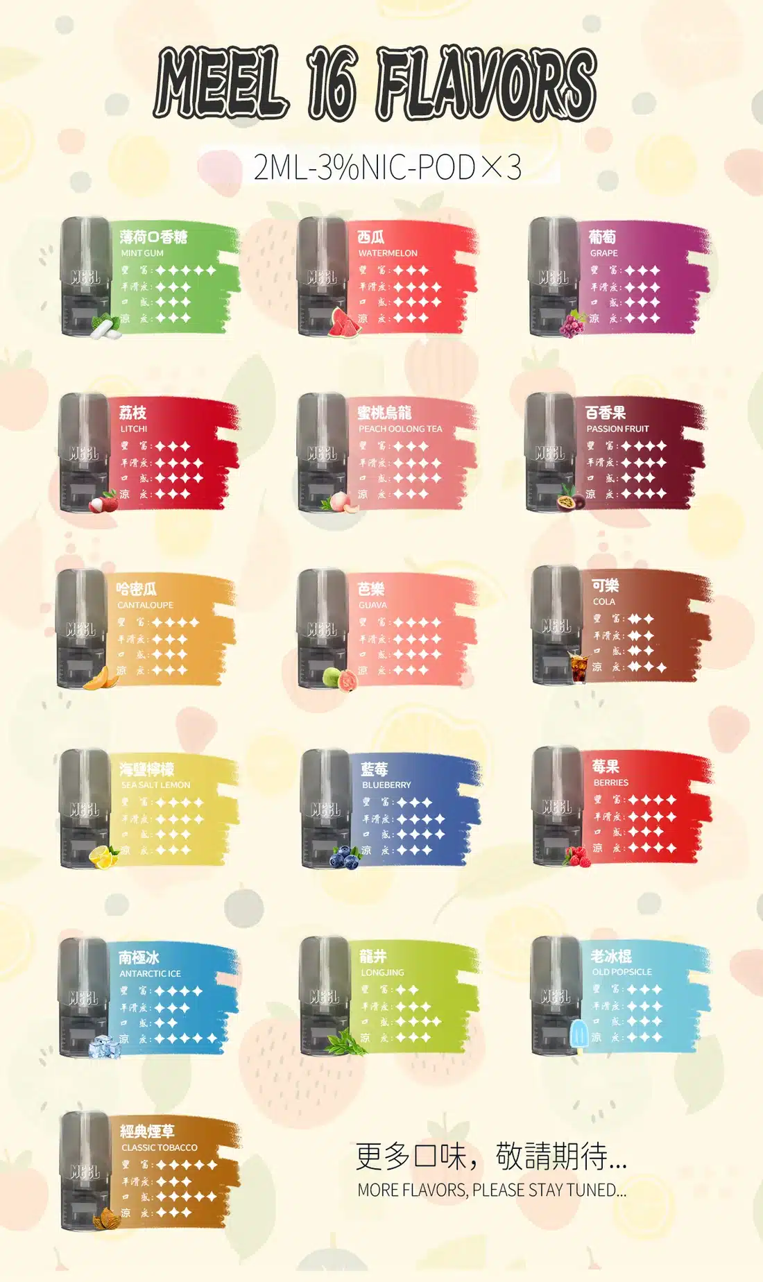 口味 | 葡萄, 百香果, 西瓜, 荔枝, 哈密瓜, 藍莓, 南極冰, 薄荷口香糖, 芭樂, 莓果, 可樂, 檸檬海鹽, 蜜桃烏龍, 龍井, 老冰棍, 經典煙草 |